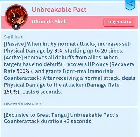 3. After casting an Ultimate Skill, grants Counterattack to front-row allied Immortals. Counterattack: When hit by normal attacks, deals Physical Damage on the target.