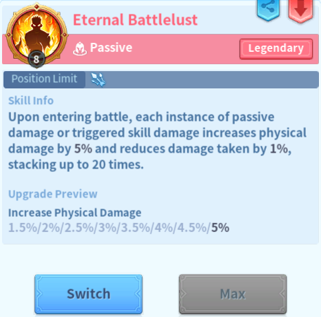 Skill Breakdown: [Eternal Battlelust]: When your passive or triggered skills deal damage, increase your physical damage by 5% and reduce damage received by 1%, up to 20 stacks. When Immortals are paired with passive or triggered skills, stacks can be accumulated rapidly, ultimately granting 100% increased physical damage and 20% damage reduction.