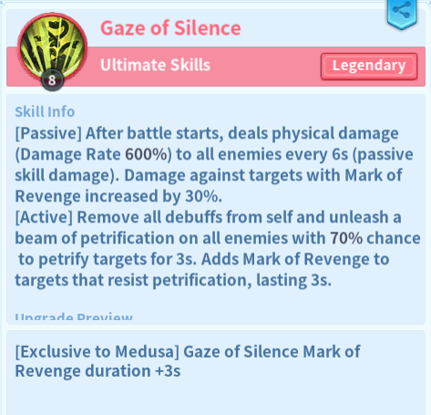 3. [Active] After casting her ultimate skill, has a 70% chance to petrify the target. Applies a mark of revenge to targets under control immunity (passive skills deal increased damage to marked targets).